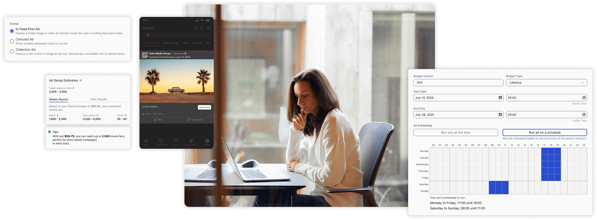 Designed 0 to 1 B2B and B2C product experiences for an early stage movie platform, helping shape advertiser workflows, consumer engagement, and scalable design systems.